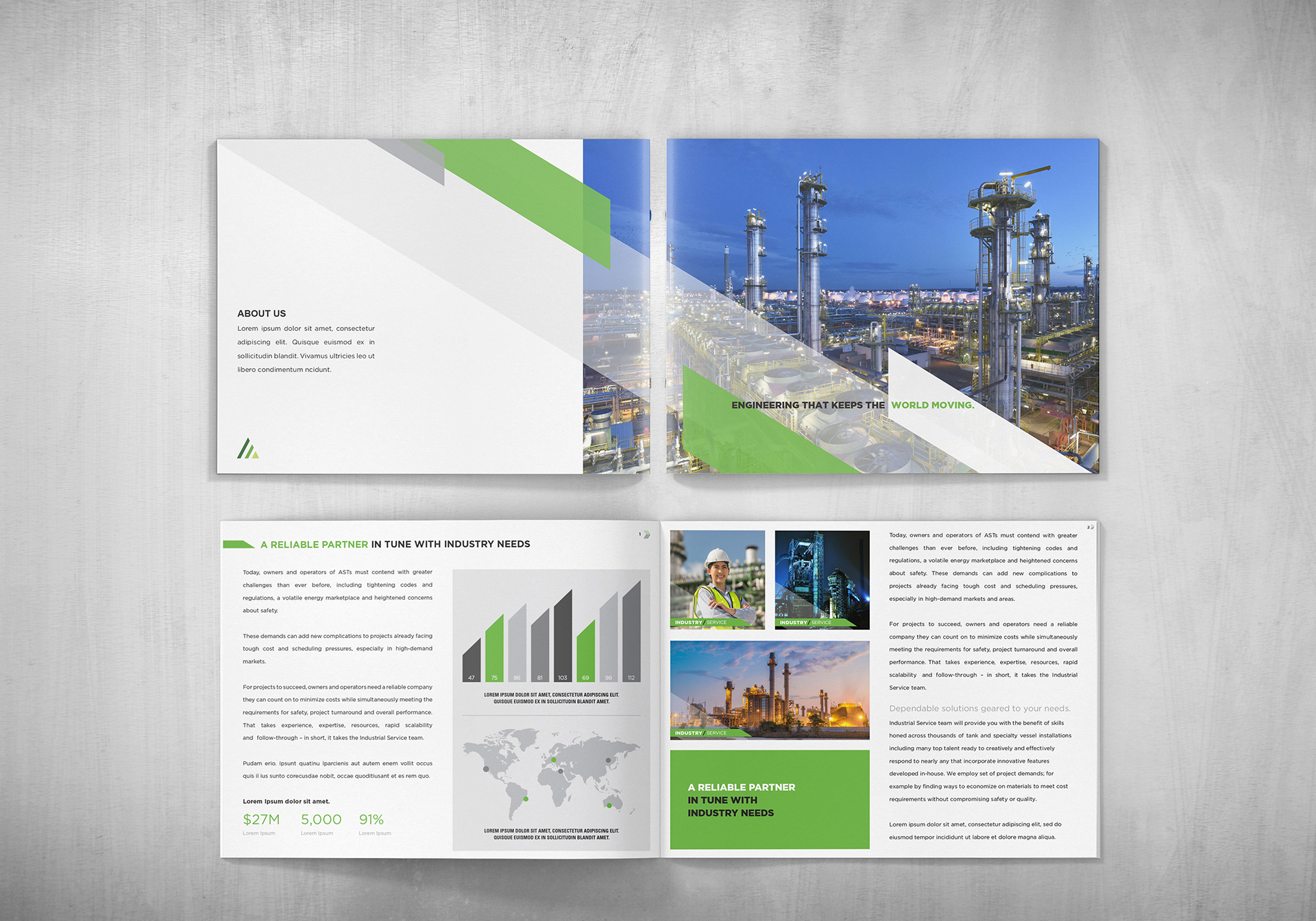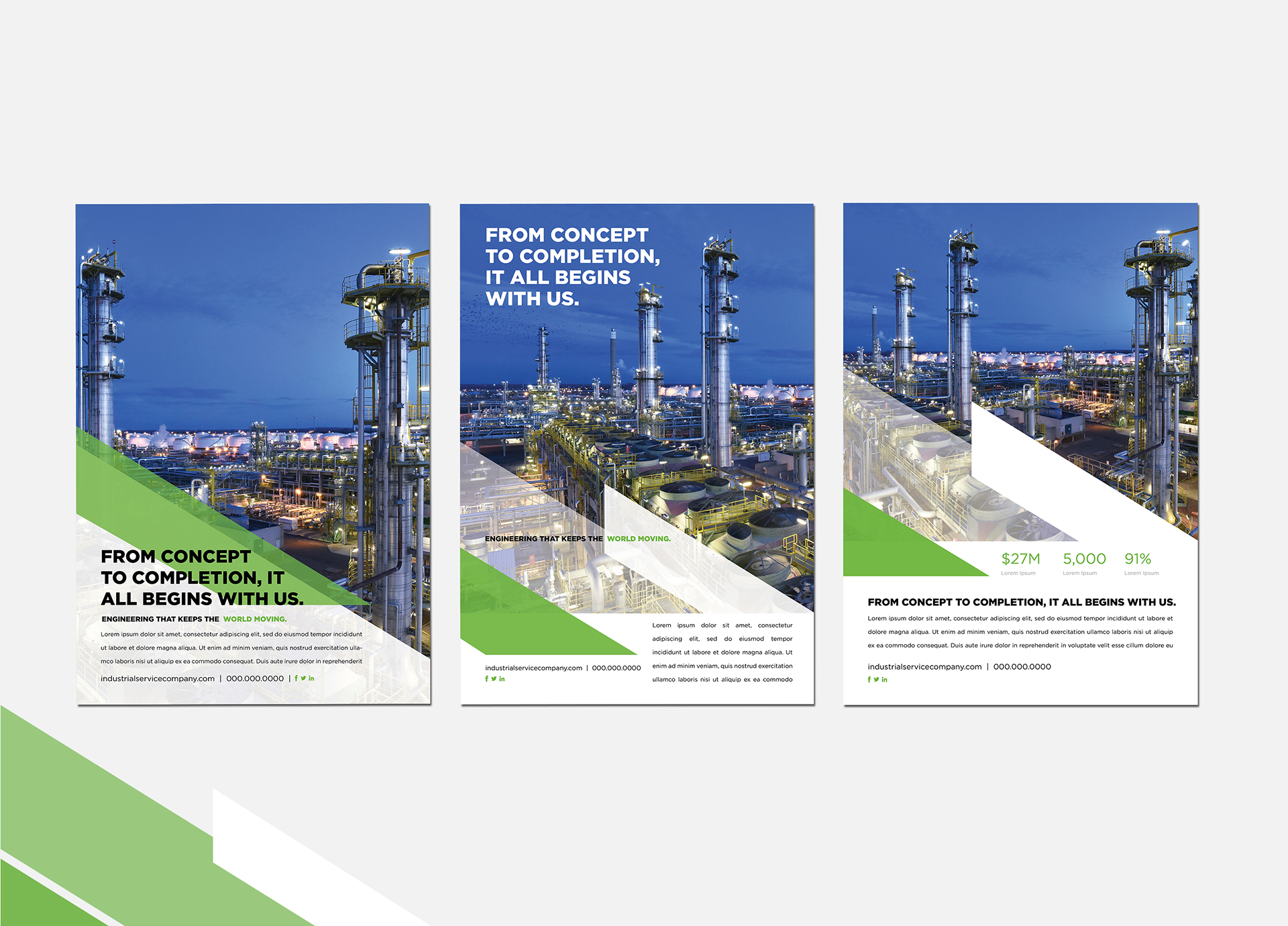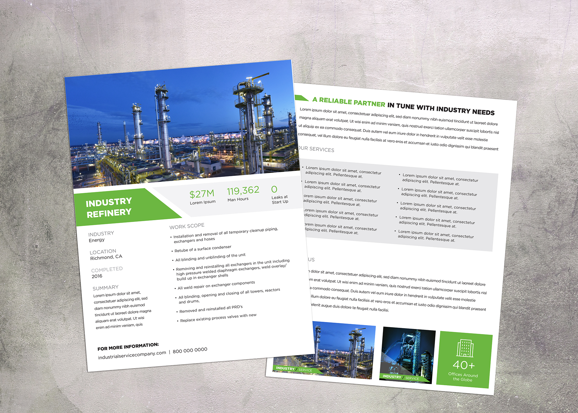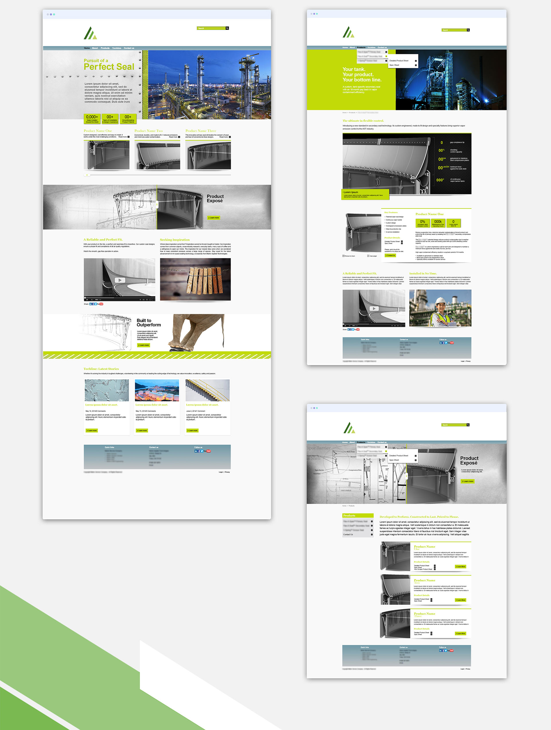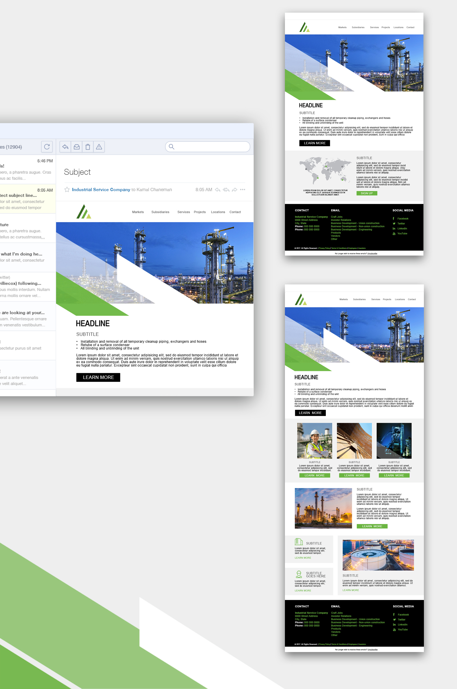 We developed a consistent look and feel to pair seamlessly with the industrial service company's new web design. The angled, layered bars and consistent color palette tie the brand together and make it instantly recognizable in a crowded marketplace.