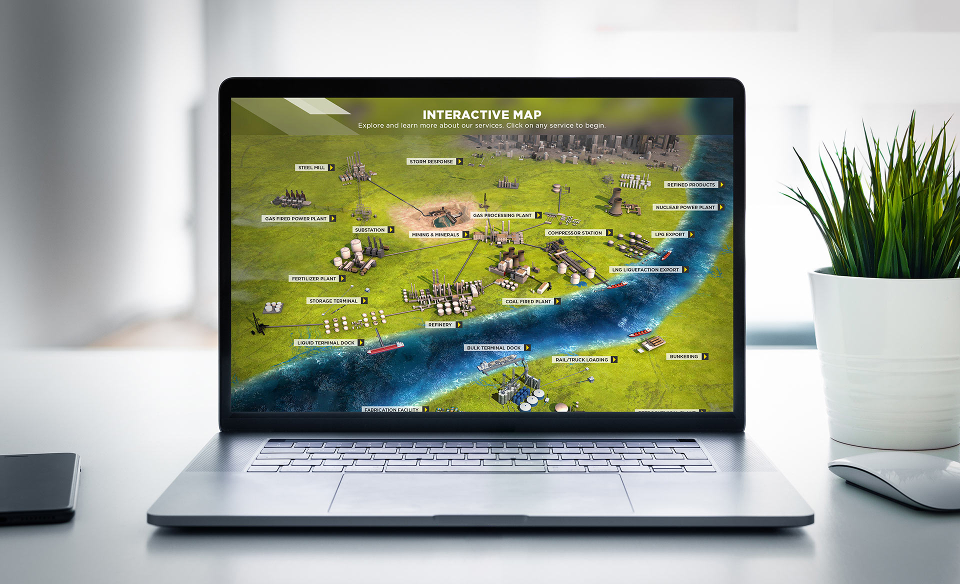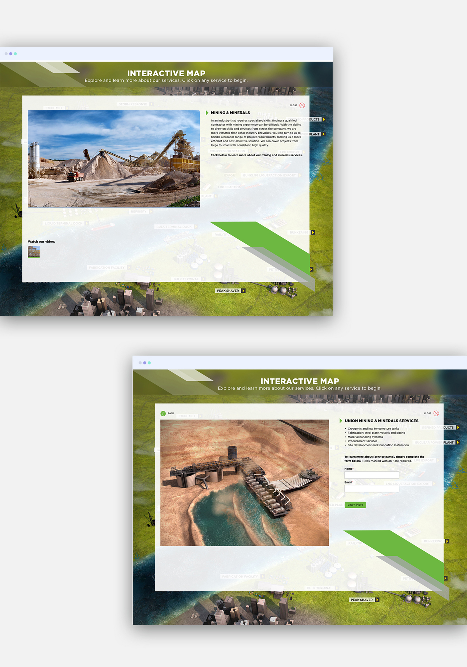 Then, we improved the user experience, functionality and design elements of an existing service interactive map to increase engagement and generate leads online and at tradeshows. Finally, we infused the new brand look and feel into their email marketing.