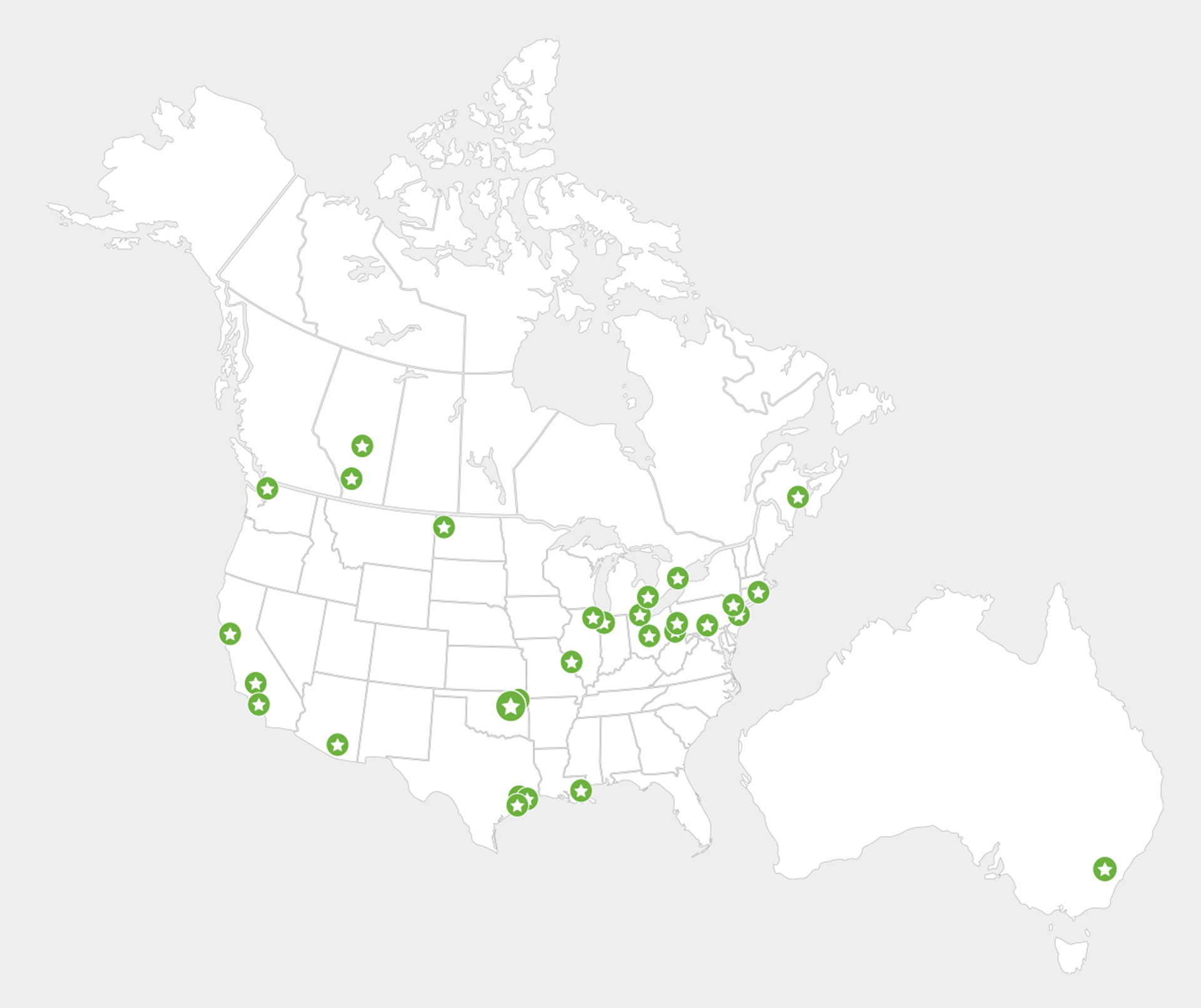 Oklahoma, California, Washington, Texas, Arizona, Ontario, New Brunswick, Pennsylvania, Illinois, Louisiania, Alberta, North Dakota, Indiana, Connecticut, New Jersey, Michigan and Ohio