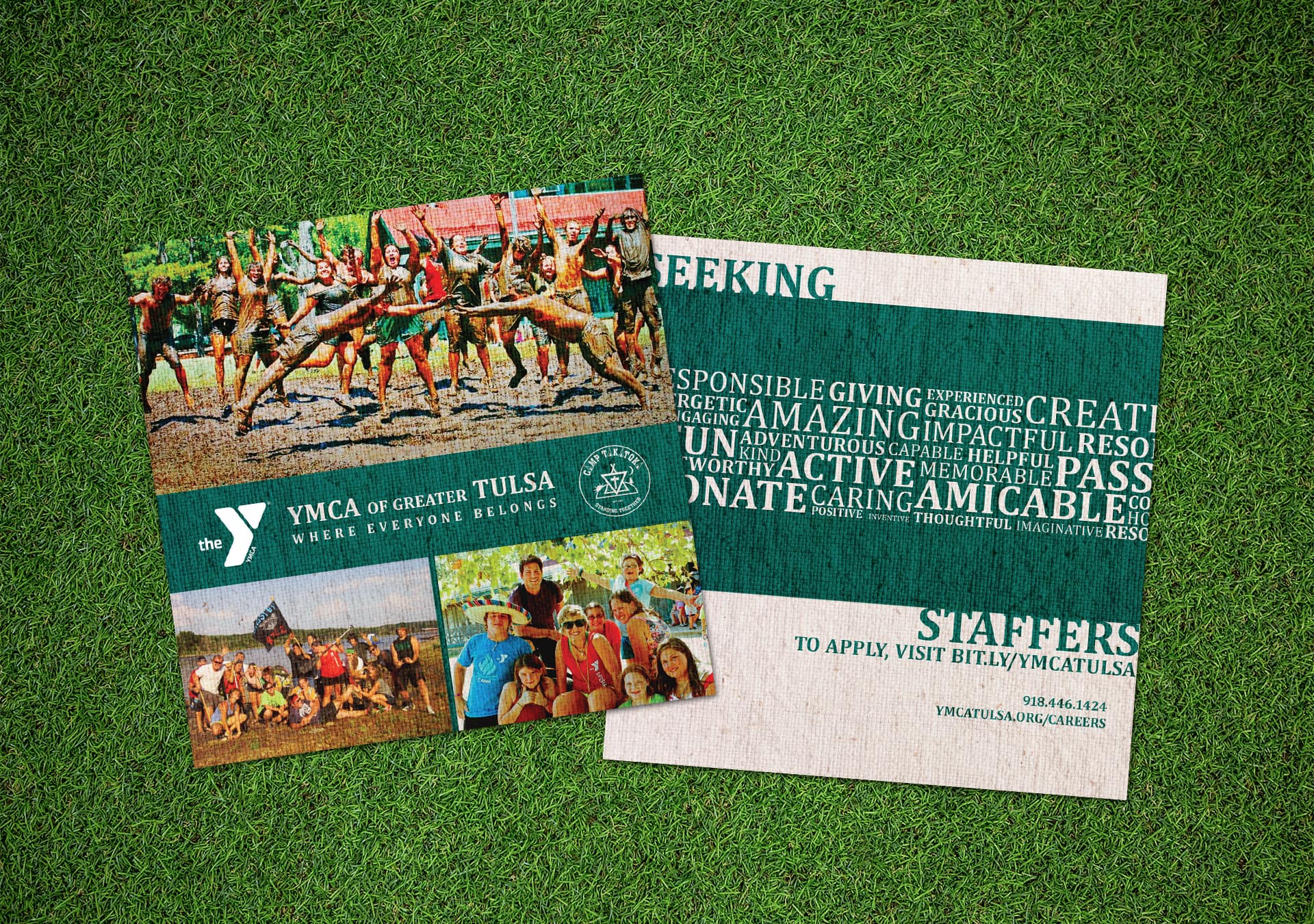 We created a recruitment handout for YMCA of Greater Tulsa to attract staff candidates for their summer camp, Camp Takatoka. Using fun, engaging images of activities, friendships and the overall positive culture was key to the approach. The wordcloud was also a fresh, fun and youthful way to communicate the qualifications and characteristics they want and attract teenage candidates.