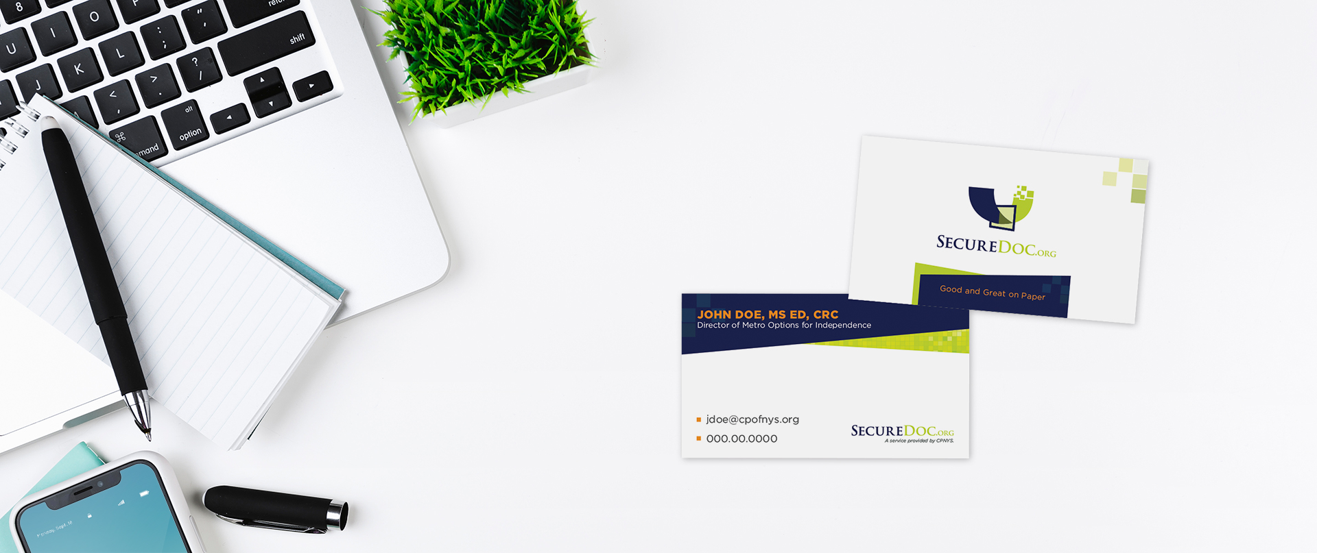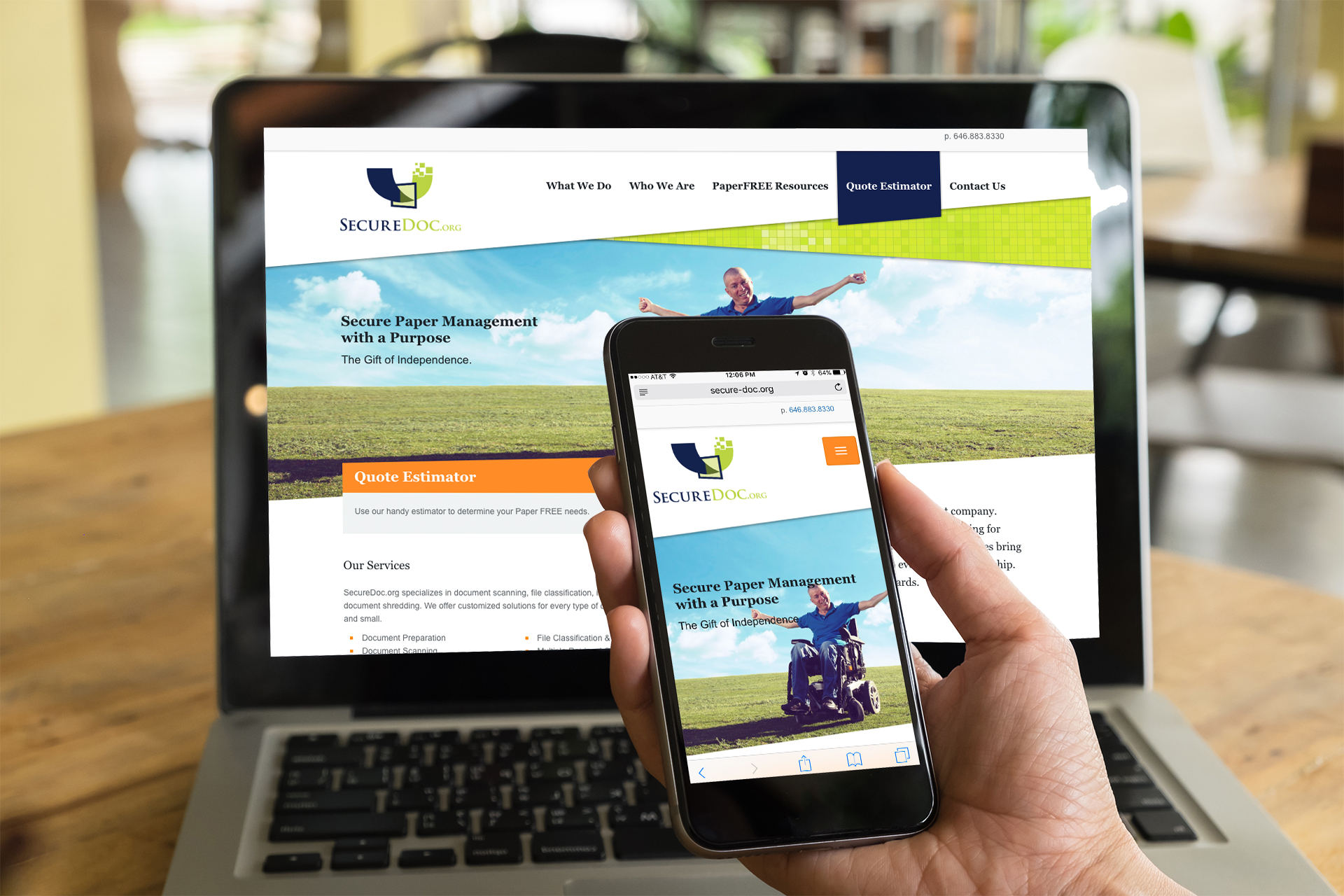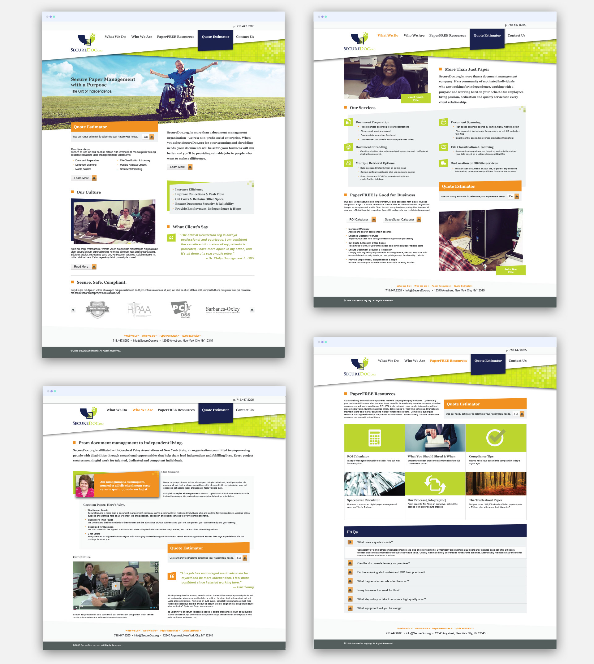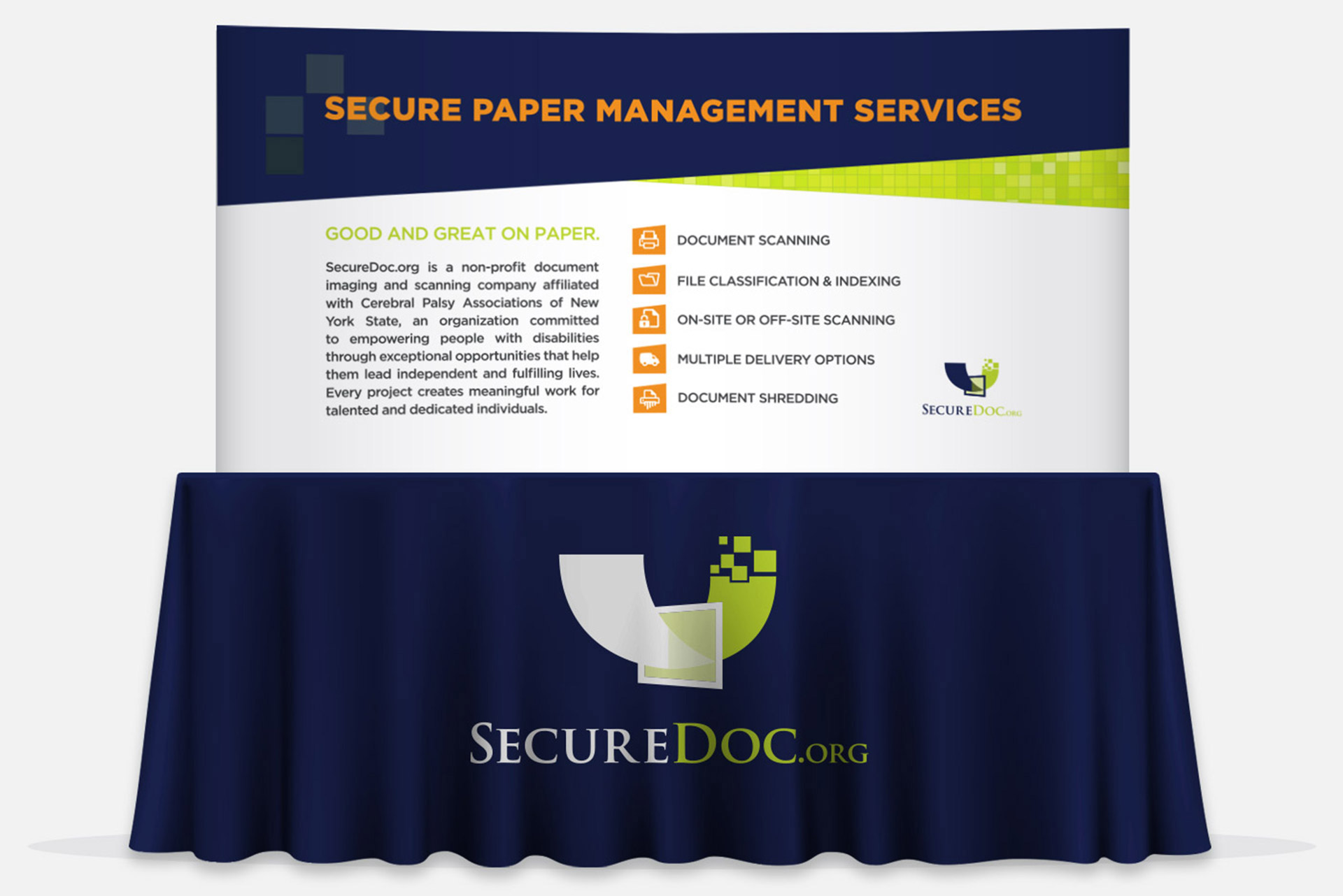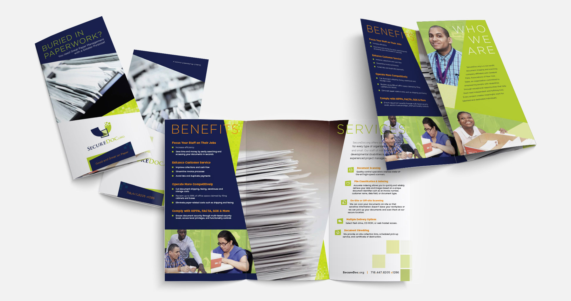 Candid shots of their disabled employees alongside “paper” graphics visually communicate the company's combined business and social missions. The main component of their business is paper and its transformation into a digital format. This inspired a layered paper "swatch" design. The diagonal shapes and shadowing give the design interest and depth so that they appear as if they are stacked documents slightly askew on a table. The squares in the logo visually represent the transformation of paper into a digital format and inspired a complimentary "pixel" pattern used throughout the design. The main component of their social mission is their people. We showcased this mission with pics of their disabled employees who have found independence, purpose, and fulfillment at SecureDoc.