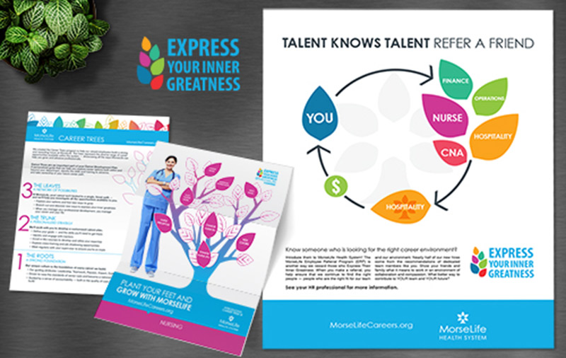 We designed logos for two of A New Leaf’s horticulture initiatives, Blooming Acres and Seeds. To maintain brand consistency, we integrated the colors and the leaf shape of their corporate logo into the new designs to signify the programs’ connection to nature and growth. We used the leaf of the corporate logo in a new ways to give each program its own identity, while maintaining a consistent overall brand image.