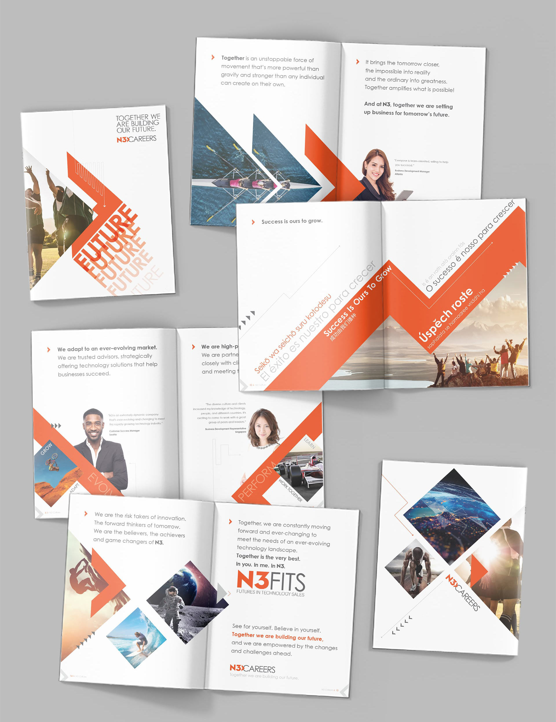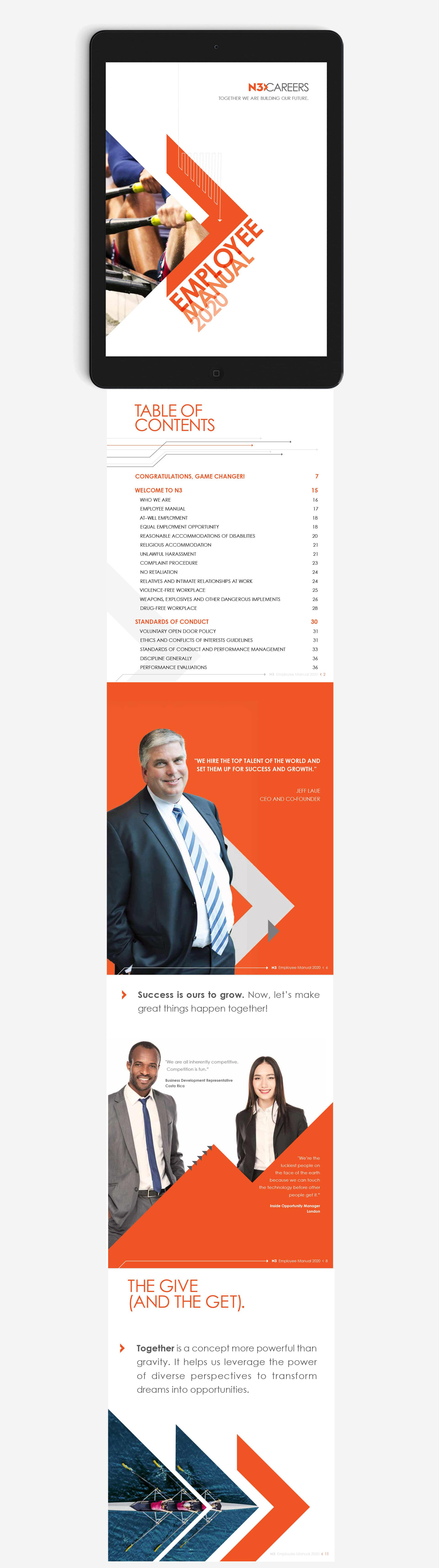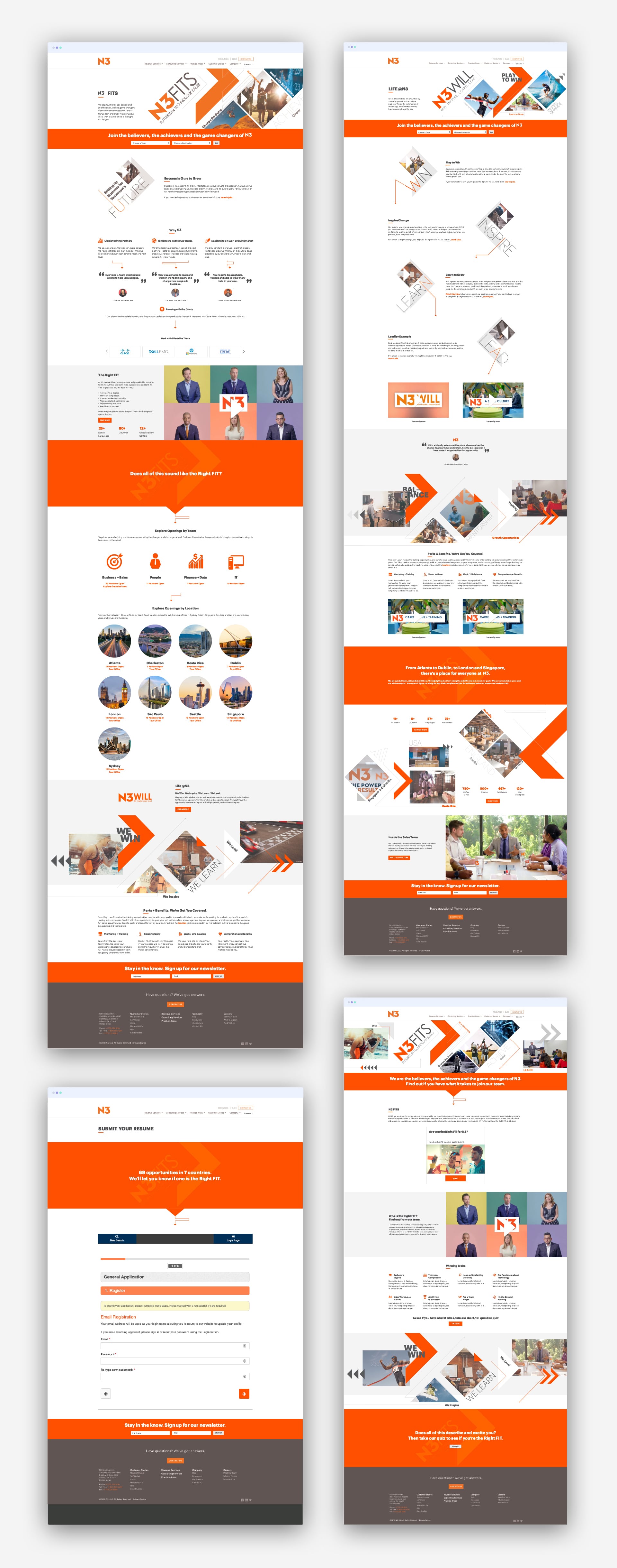 The use of bold graphics, type at different angles, disruptive edgy layout, sports metaphors, overlapping elements, arrows and diagonal lines are key parts of engaging potential candidates and communicating the new employer #RallyPoint. These disruptive elements communicate N3’s cutting-edge approach to software sales and their internal culture at a glance.