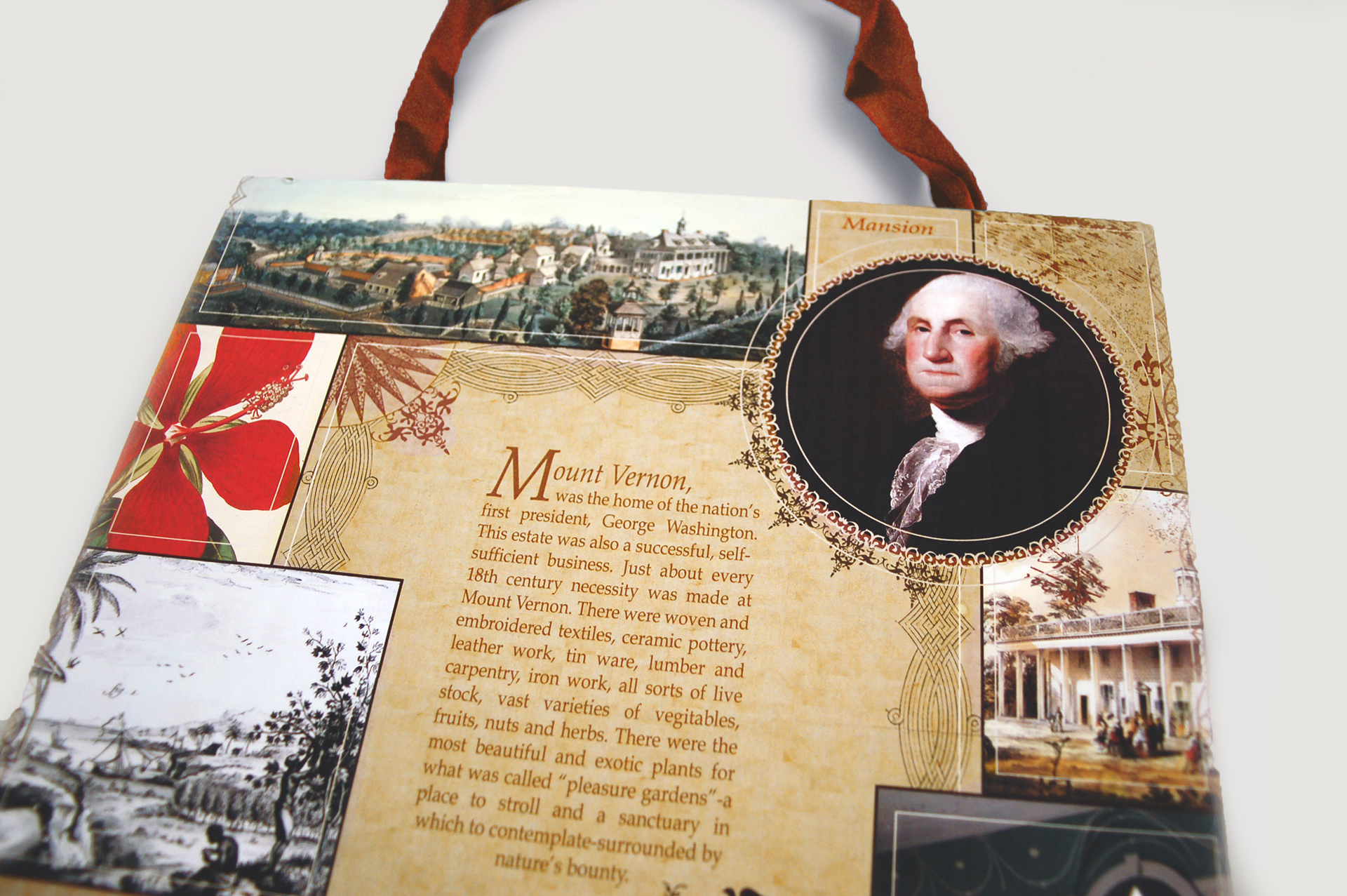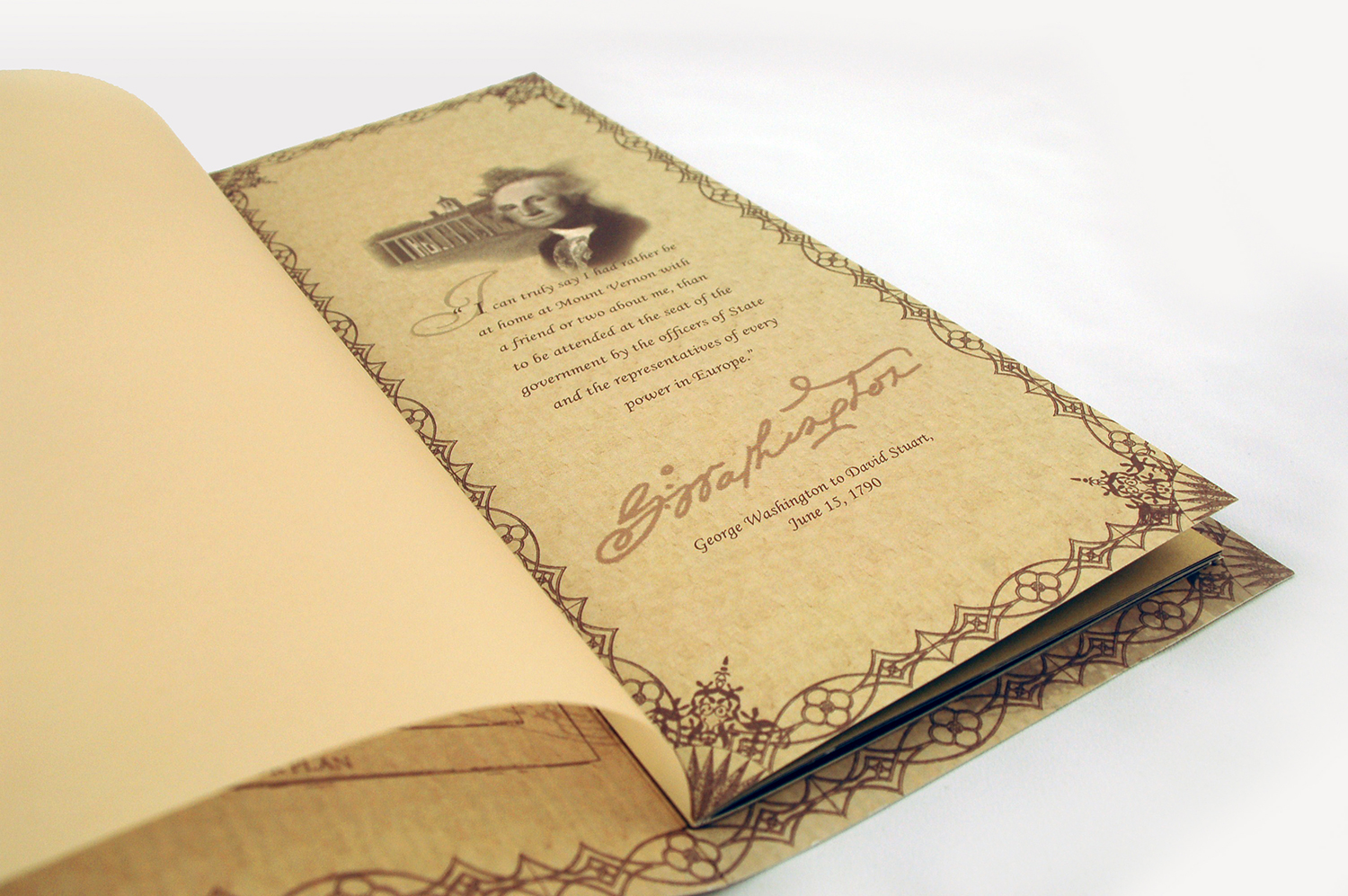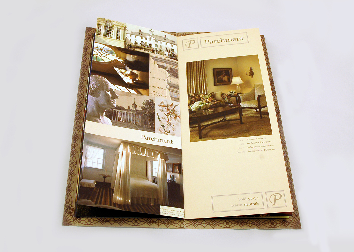 For the collection, the Mount Vernon Historical Society shared Washington’s architectural drawings, sketches, letters, prints, and estate images with Fabricut. These were a key part of communicating the historical inspiration and authenticity behind the new fabrics in the design. To communicate the line’s historical significance and inspiration pieces, we created an elaborate montage for the collection’s look and feel. We compiled it on a parchment paper background to instantly give the line a genuine, antique quality. Then, to make it come to life, we filled it with Washington’s estate images, snippets of drawings, handwriting samples, illustrations, paintings, seals, monograms, and more